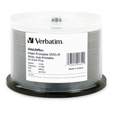 Verbatim DVD+R 4.7GB 16X White Inkjet Printable with Branded Hub - 50pk Spindle