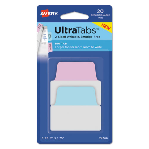 Ultra Tabs Repositionable Tabs, 2 x 1 3/4, Pastel: Blue, Pink, 20/Pack