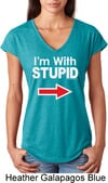 I'm With Stupid White Print Ladies Tri Blend V-Neck Shirt