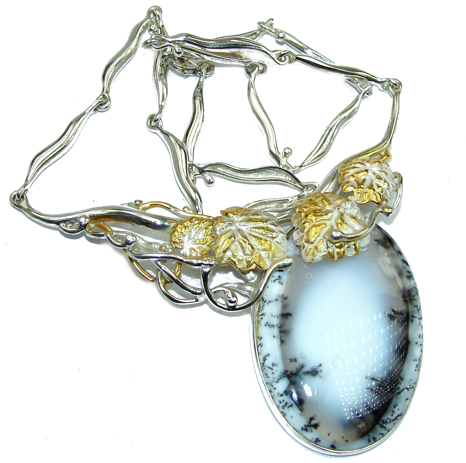Oversized genuine Dendritic Agate two tones .925 Sterling Silver handcrafted necklace