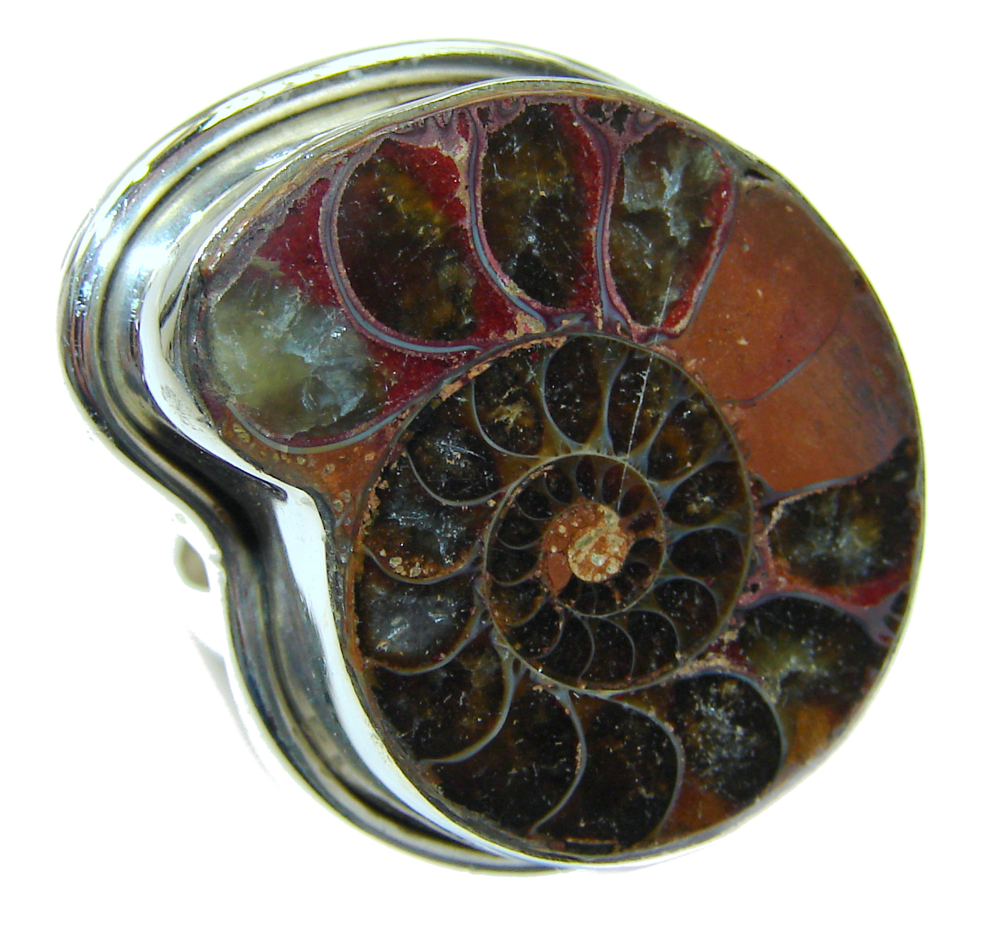 Stylish Brown Ammonite Fossil Sterling Silver Ring s. 8