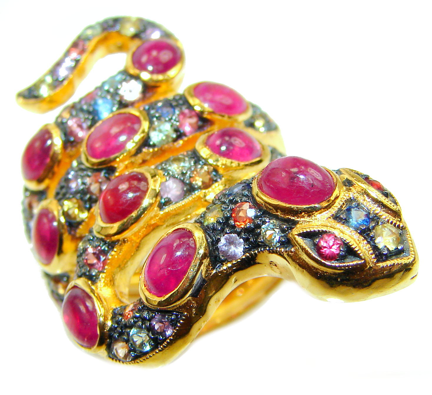 An exuberantly Large Snake Genuine Ruby Sapphire 18K Gold over .925 Sterling Silver handmade Ring size 6 3/4