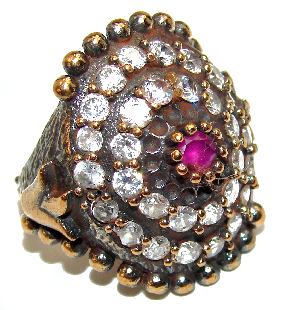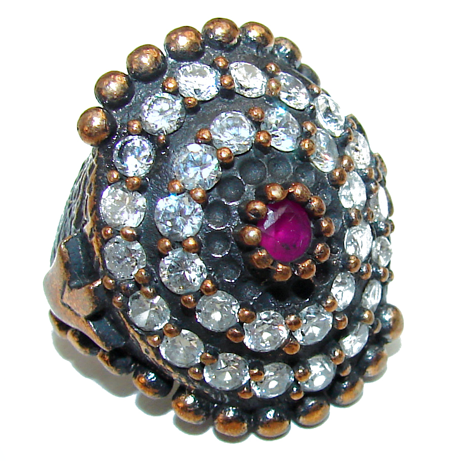 Victorian Style created Ruby & White Topaz Copper over Sterling Silver ring; s. 6 1/2