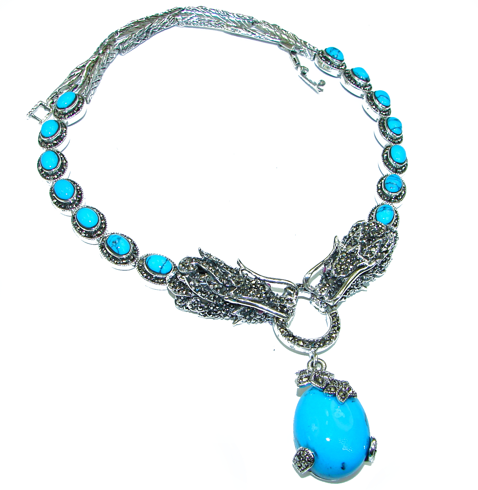 Two Dragons Genuine inlay Turquoise Marcasite .925 Sterling Silver handmade handcrafted Necklace