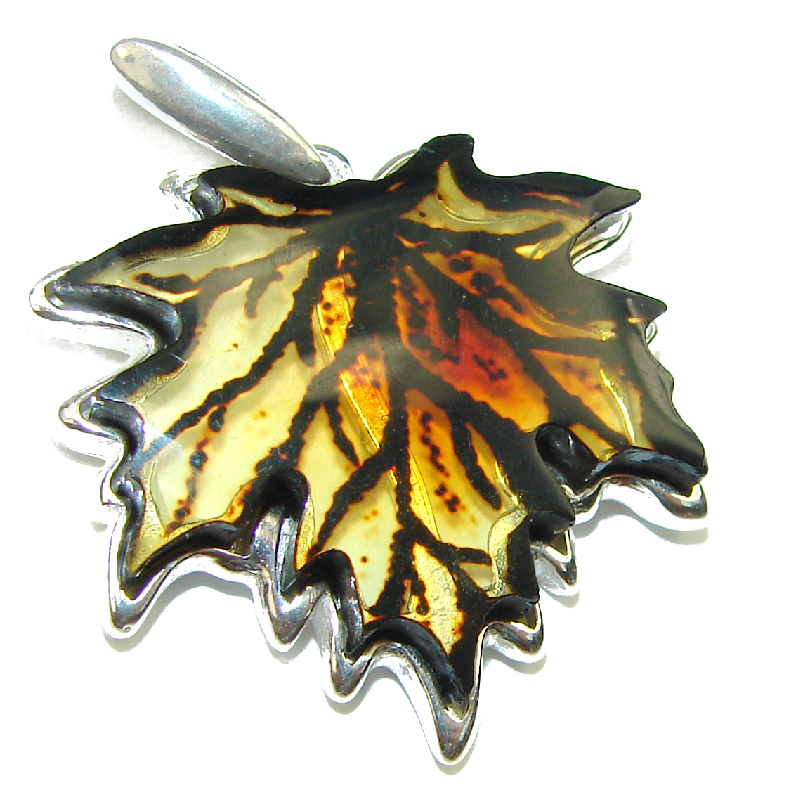 Golden Leaf natural carved Baltic Amber .925 Sterling Silver handmade Pendant