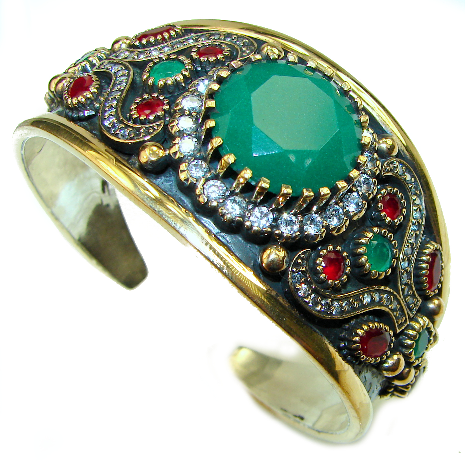 Victorian Style Created Emerald & White Topaz Sterling Silver Bracelet / Cuff
