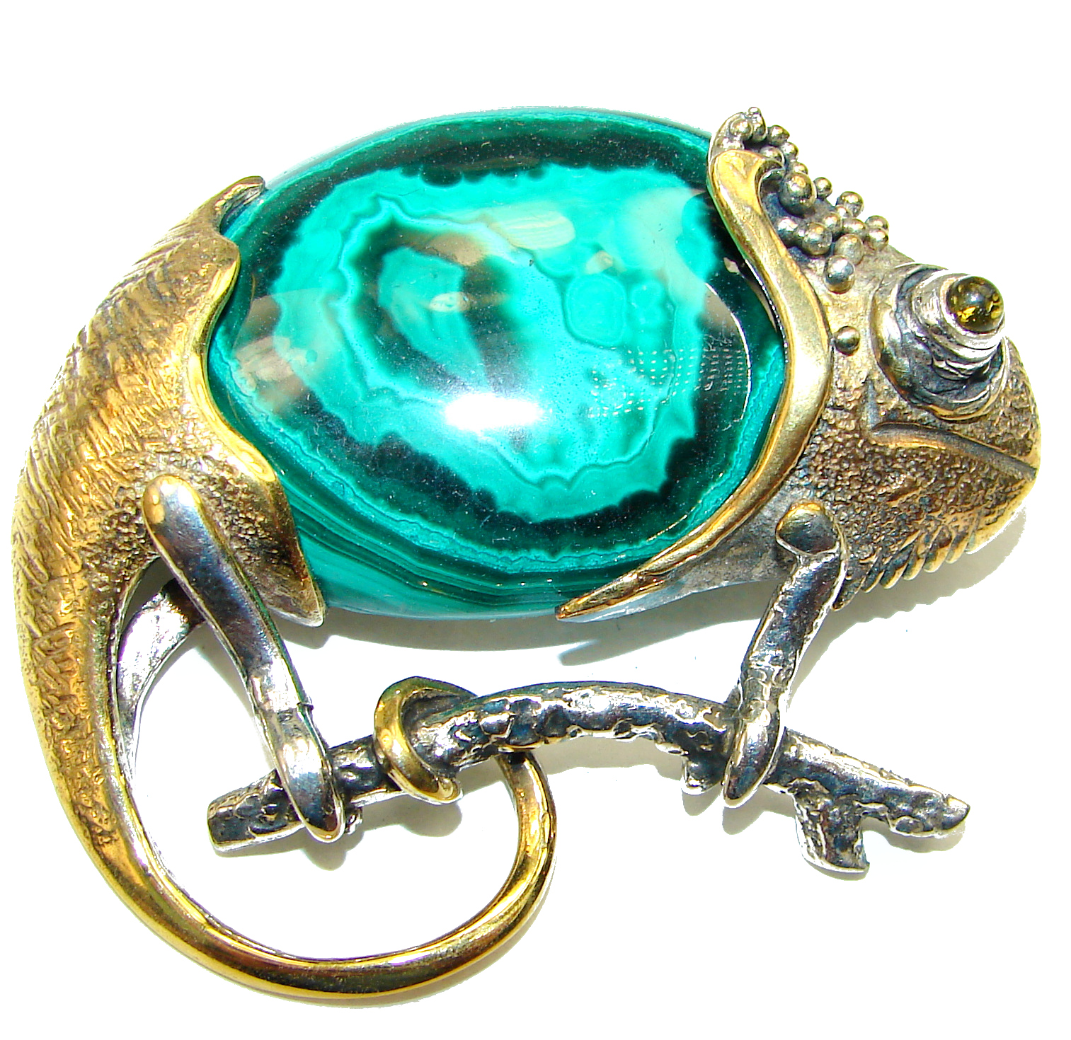 Spectacular Big Chameleon lizard Natural Malachite .925 Sterling Silver handmade Pendant Brooch