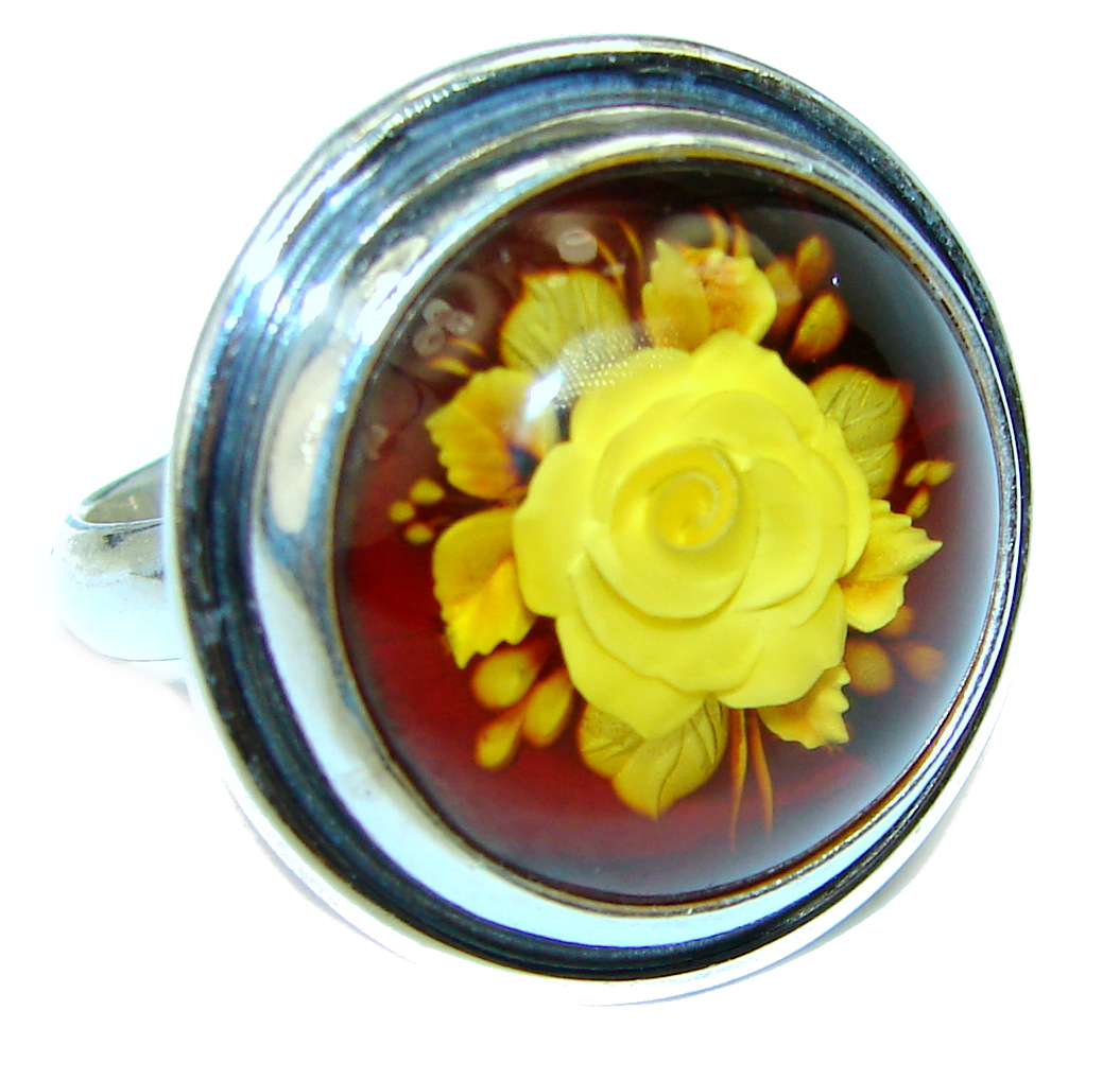 Beautiful Authentic carved FLOWER Baltic Amber .925 Sterling Silver handcrafted ring; s. 8 1/4