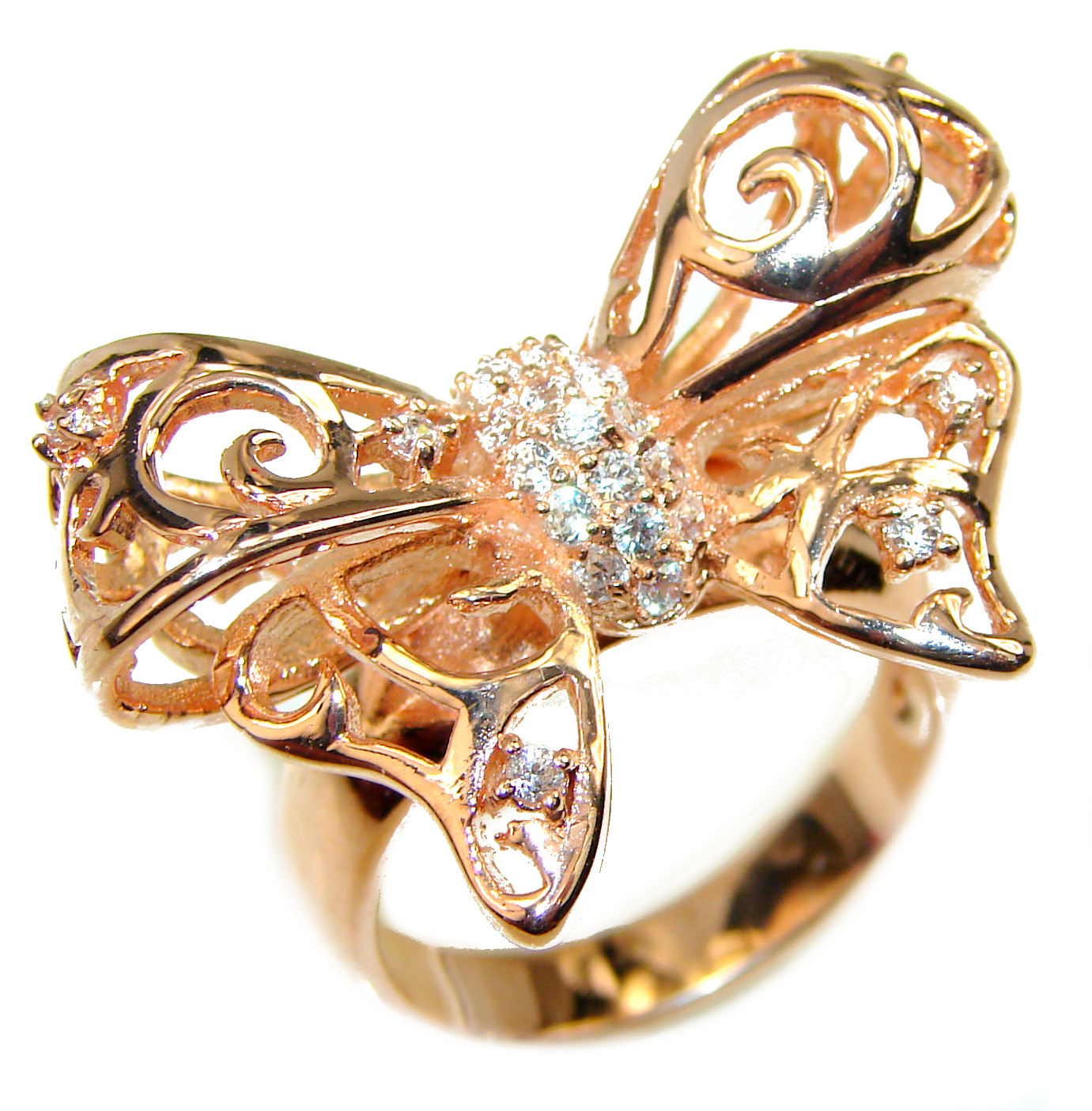 Luxury Ribbon White Topaz 14K Rose Gold over .925 Sterling Silver handmade Ring size 7