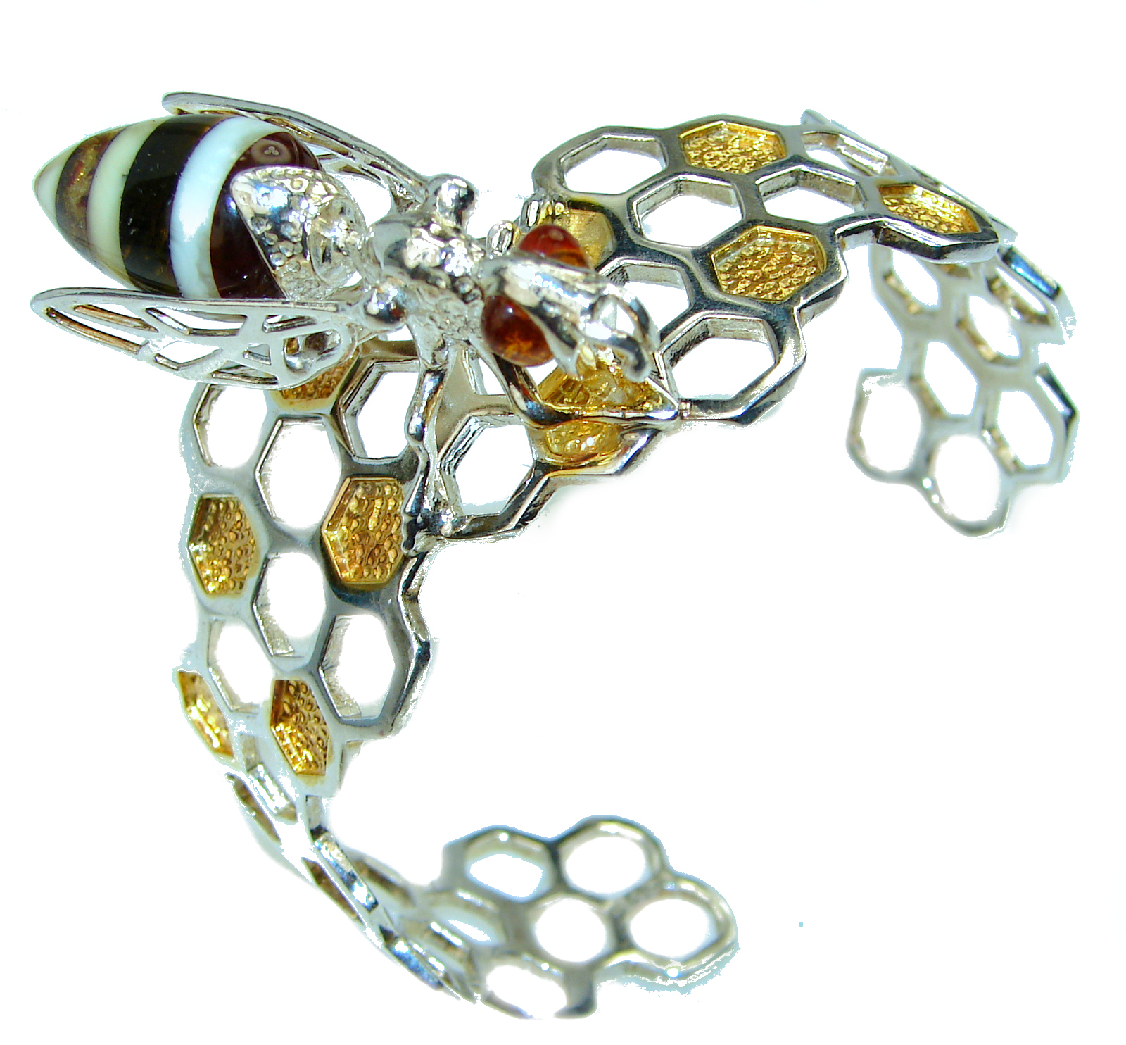 Real Masterpiece Honey Bee Polish Amber Two Tones .925 Sterling Silver HANDCRAFTED Bracelet / Cuff