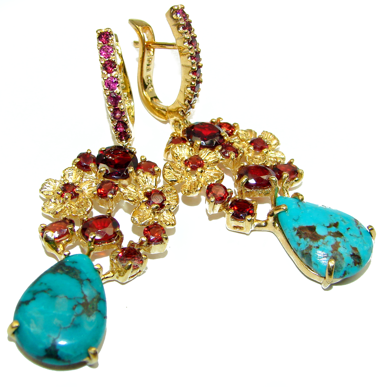 Genuine Beauty Turquoise Garnet 14K Gold over .925 Sterling Silver handcrafted Earrings