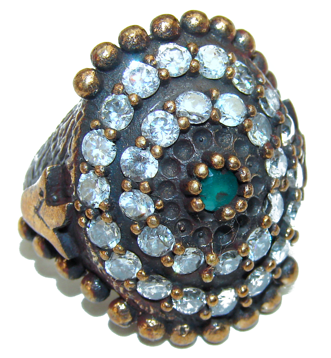 Victorian Style created Emerald & White Topaz Copper over Sterling Silver ring; s. 7