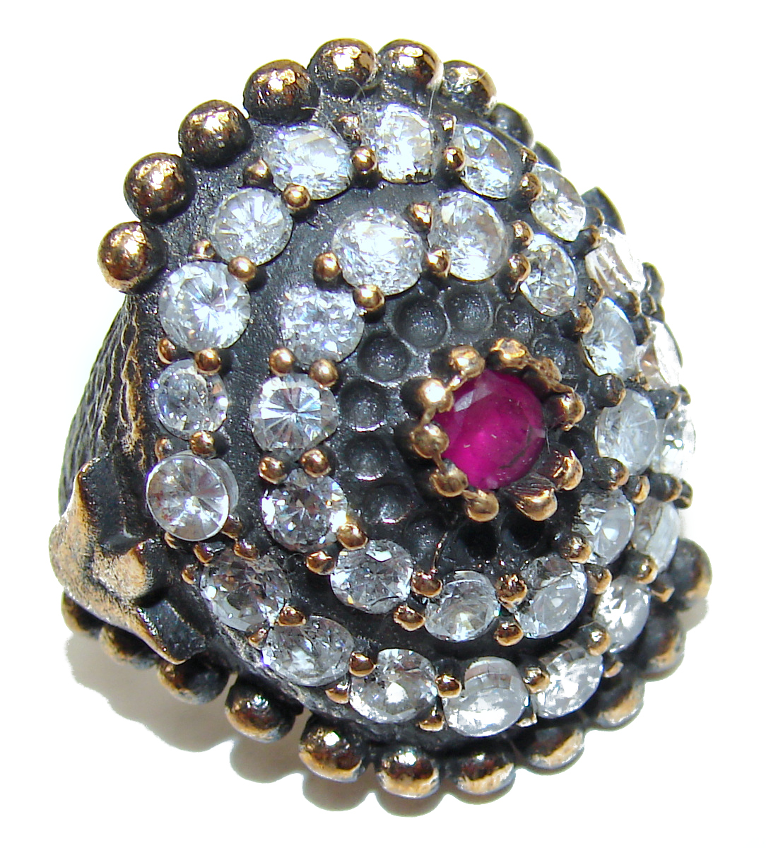 Large Victorian Style created Ruby & White Topaz Sterling Silver ring; s. 6 3/4