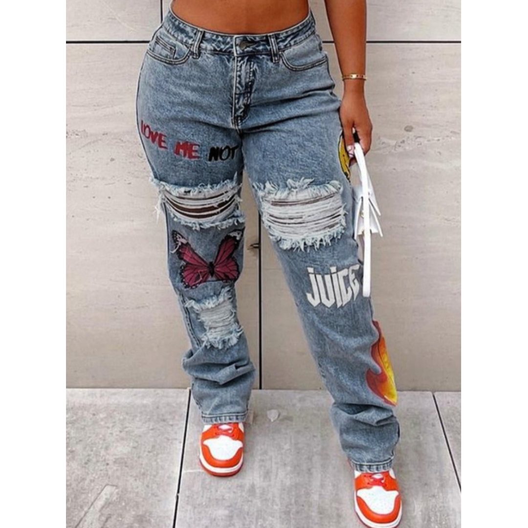 LW Plus Size Butterfly Letter Print Ripped Jeans