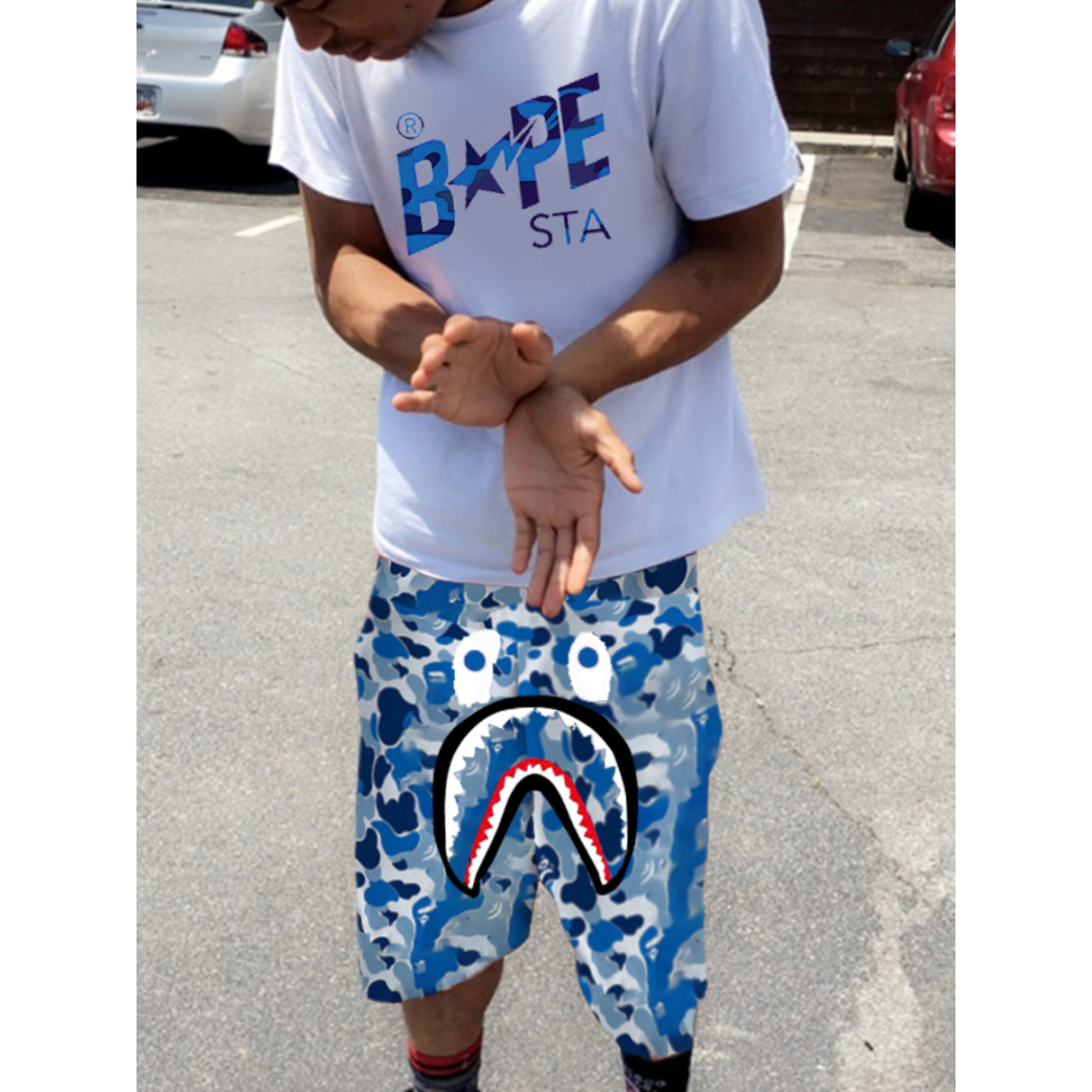 LW Men Fish Mouth Camo Letter Print Shorts Set