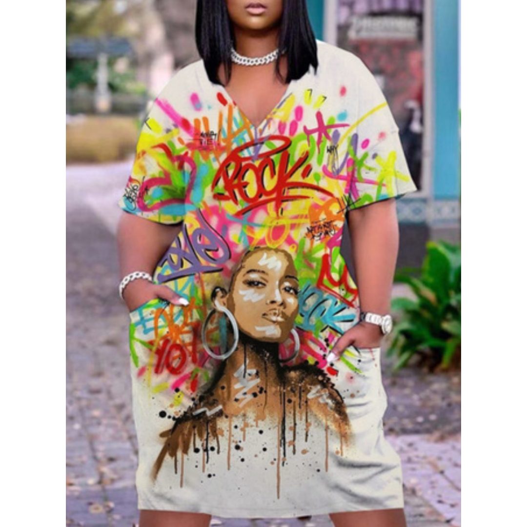 LW Plus Size Graffiti Figure Print Pocket Design Dress