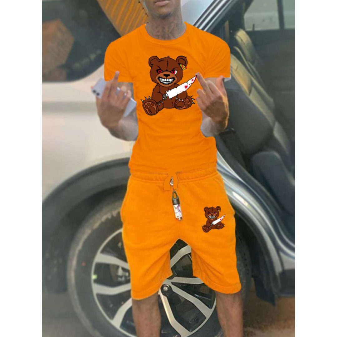 LW Men Bear Cartoon Print Drawstring Shorts Set