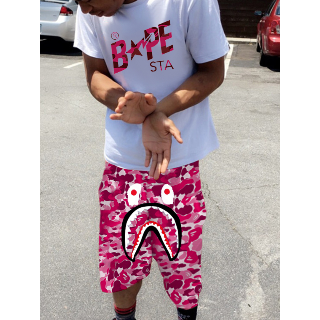 LW Men Fish Mouth Camo Letter Print Shorts Set