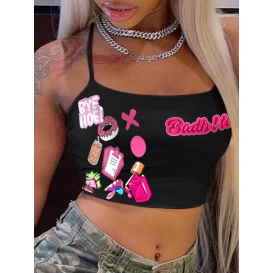 LW One Shoulder Queen Letter Print Split Shorts Set