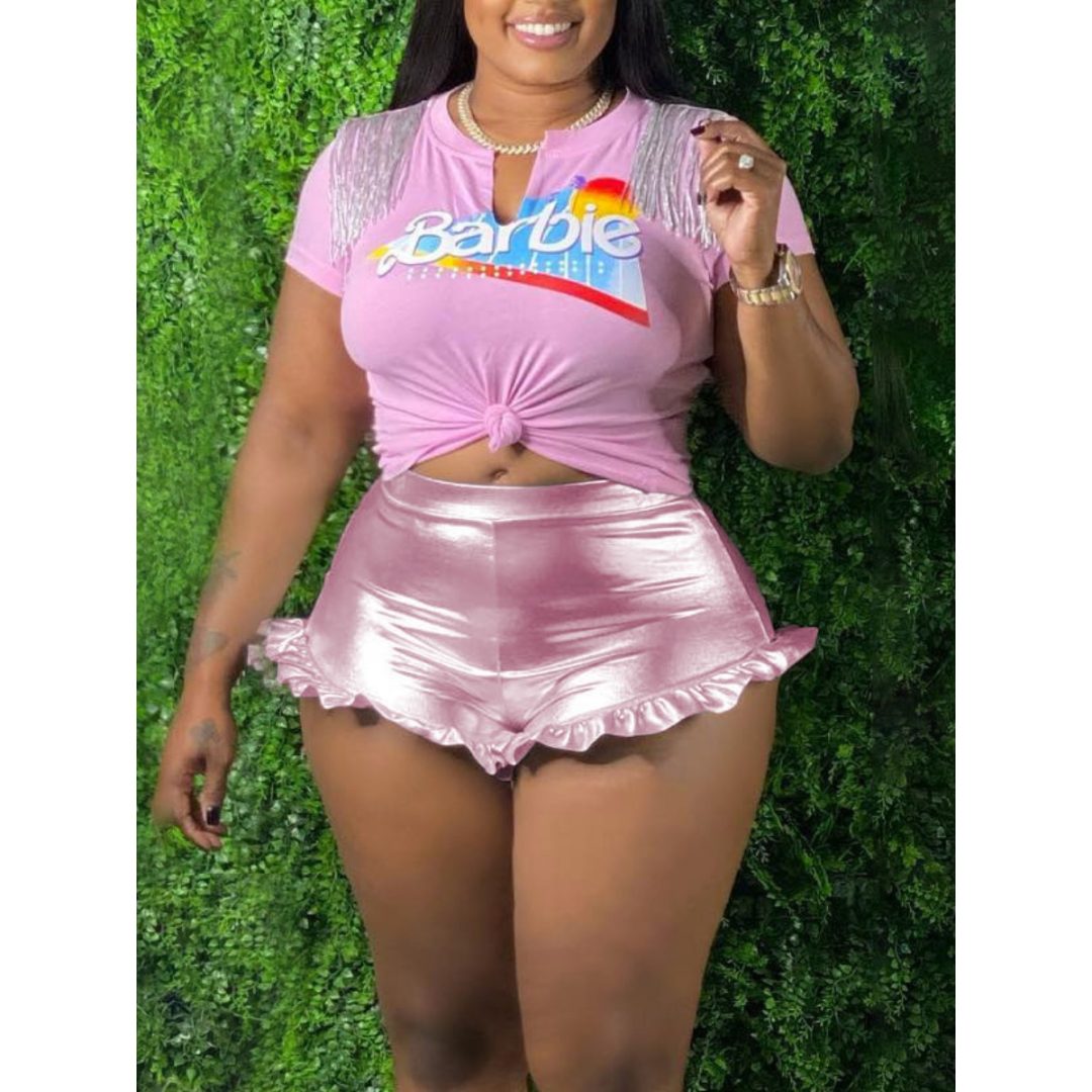 LW Plus Size Pink Letter Print Skinny Shorts Set