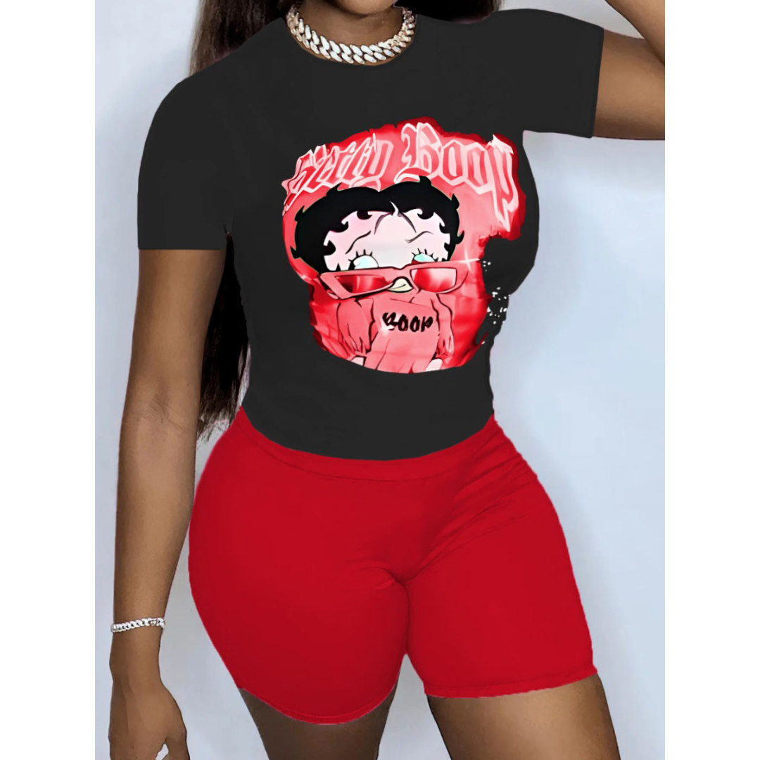 LW Plus Size Cartoon Letter Print Skinny Shorts Set