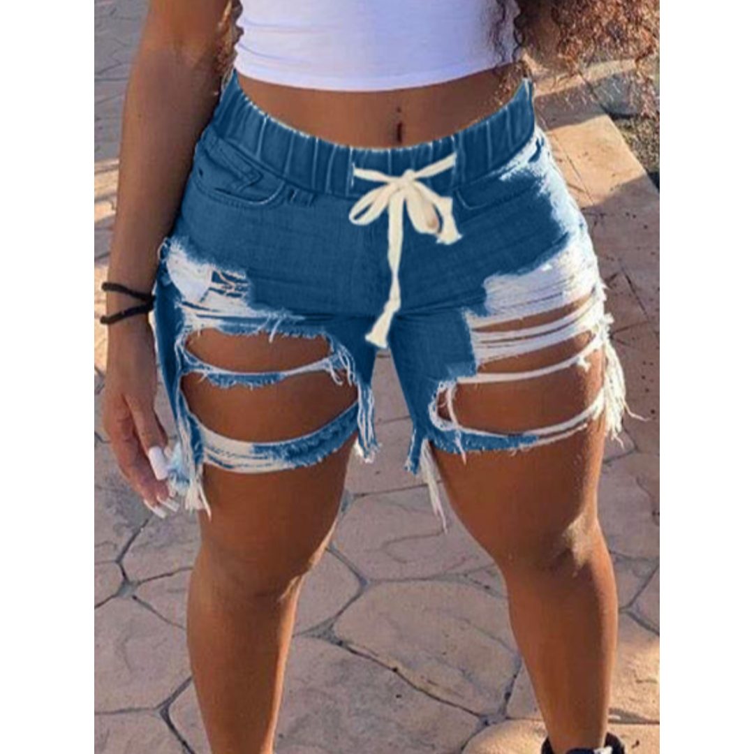 LW Mid Waist Distressed Ripped Drawstring Denim Shorts