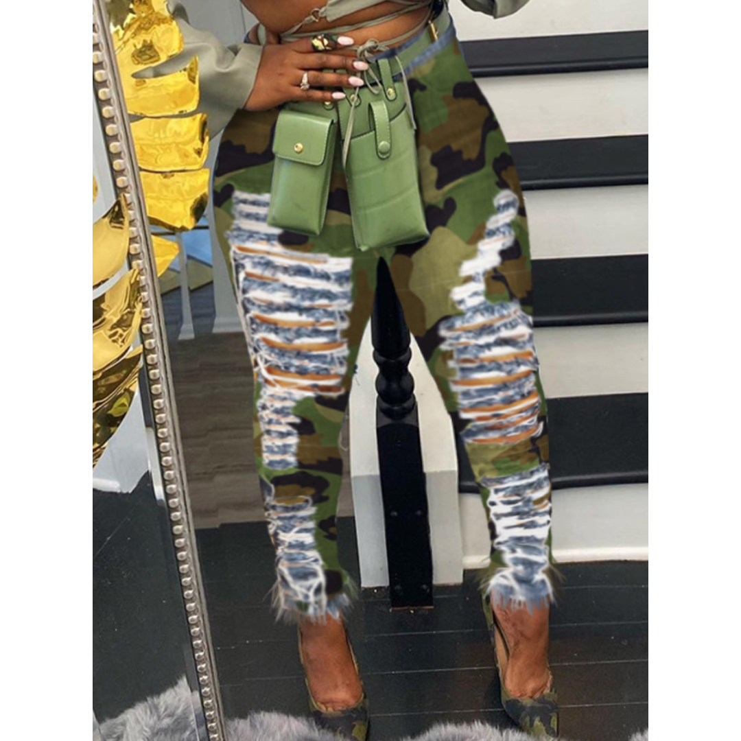 LW High Stretchy Broken Holes Camouflage Printed Jeans