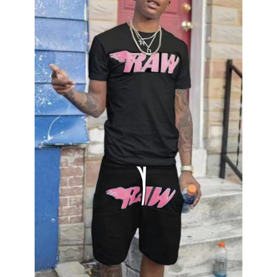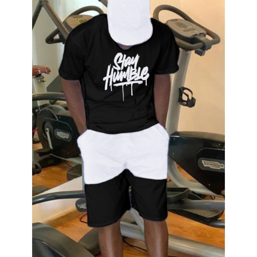 LW Sporty Turndown Collar Letter Print Black Two Piece Shorts Set