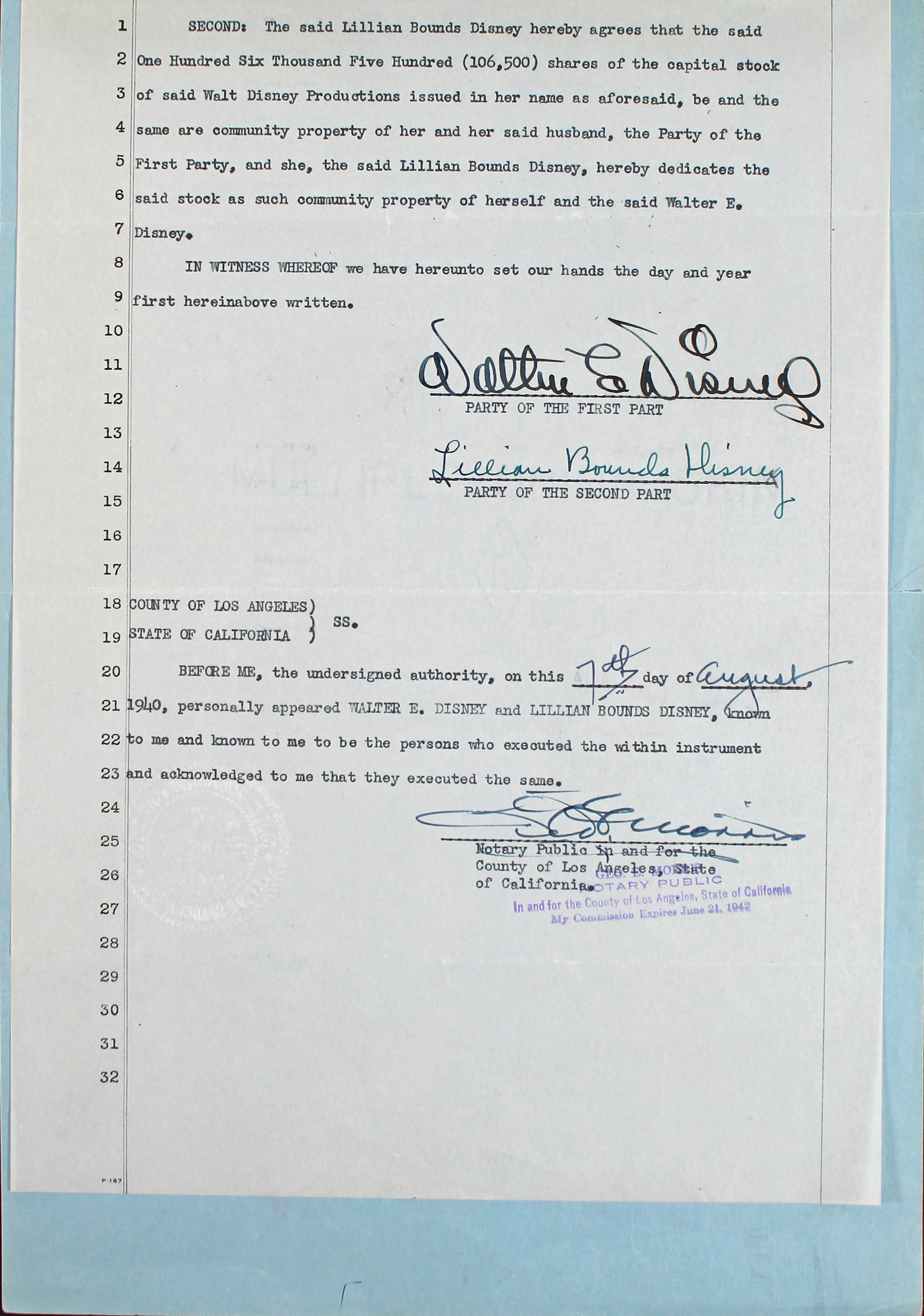 Walt Disney & Lillian Disney Signed 2 Page 8.5x13 1940 Contract BAS #A57638
