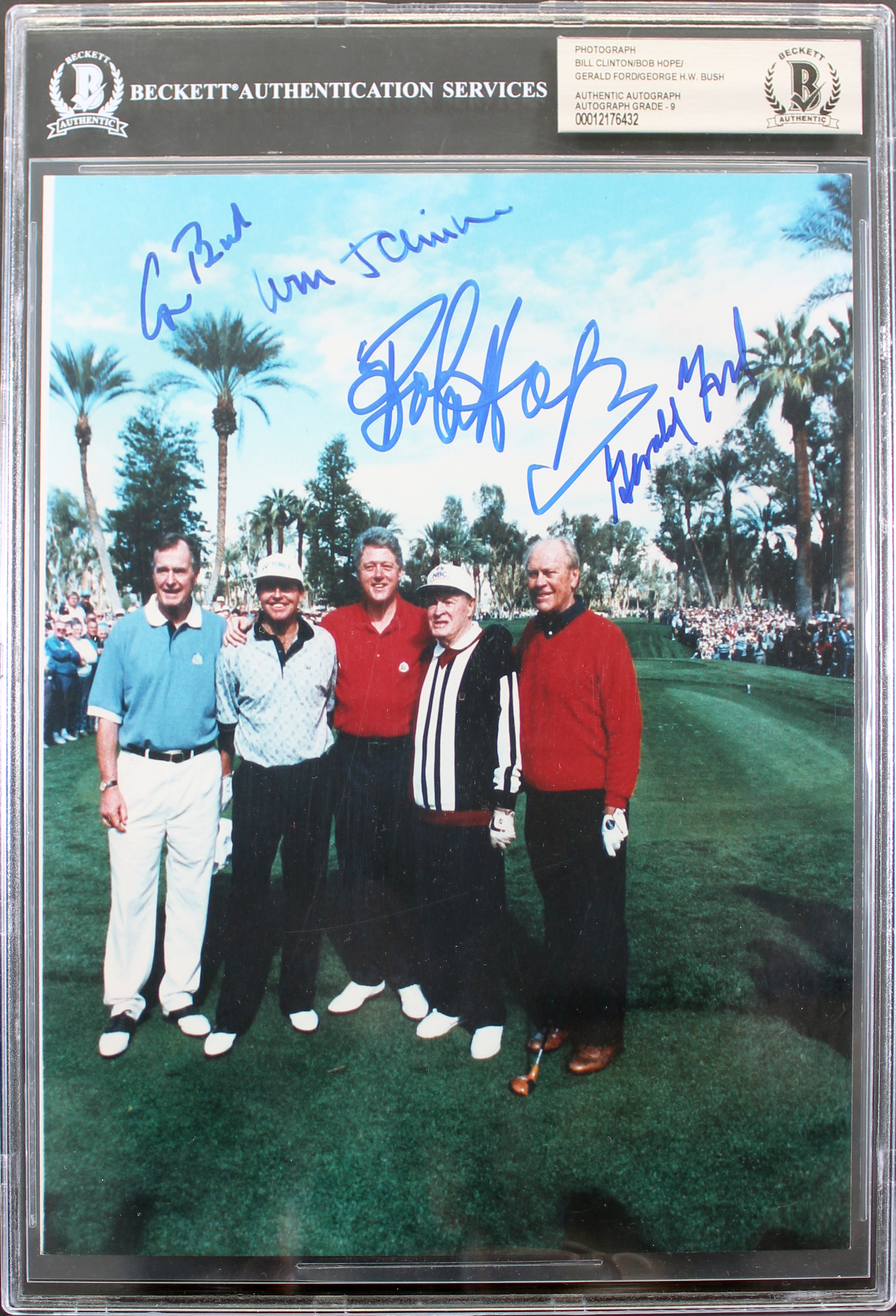 (4) Clinton, Bush, Ford & Bob Hope Signed 8x10 Photo Autos Graded 9! BAS Slabbed