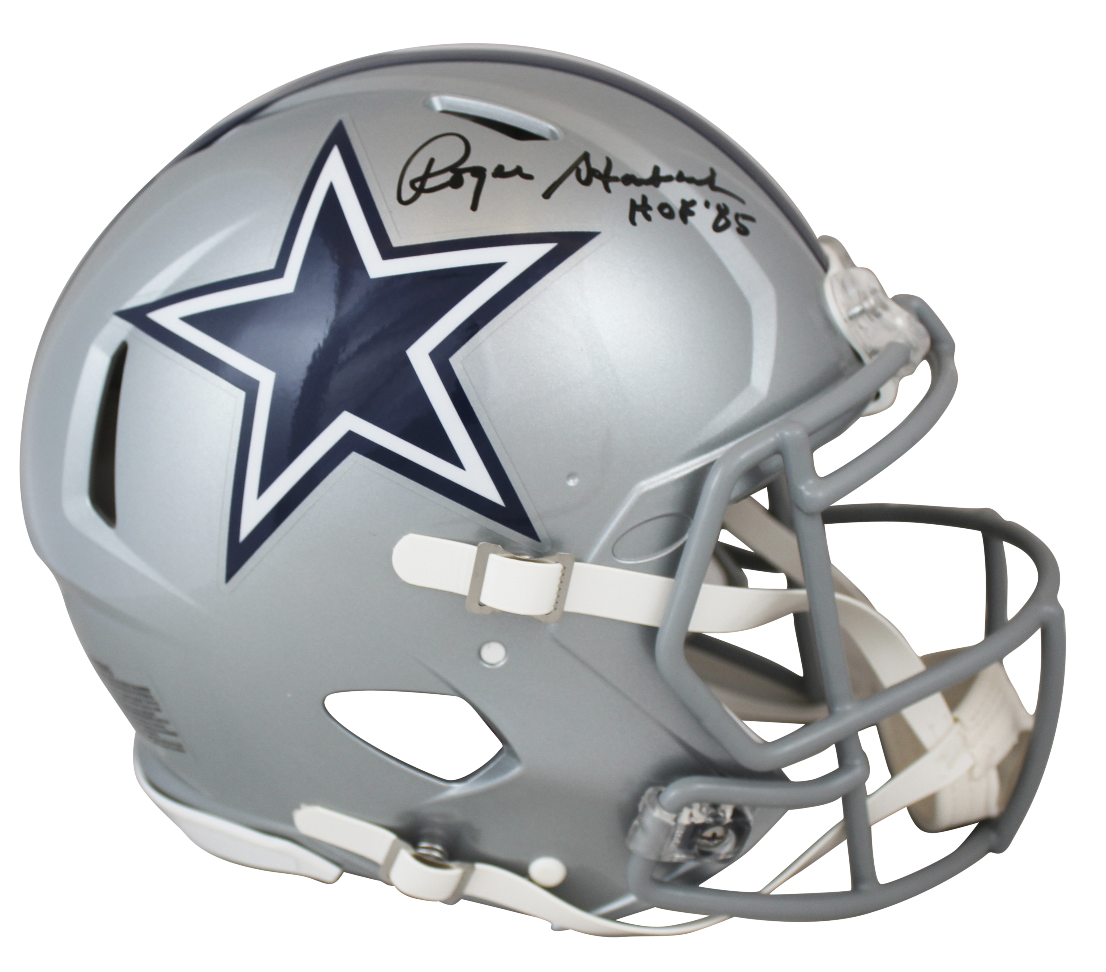 Cowboys Roger Staubach "HOF 85" Signed SIlver Full Size Speed Proline Helmet BAS