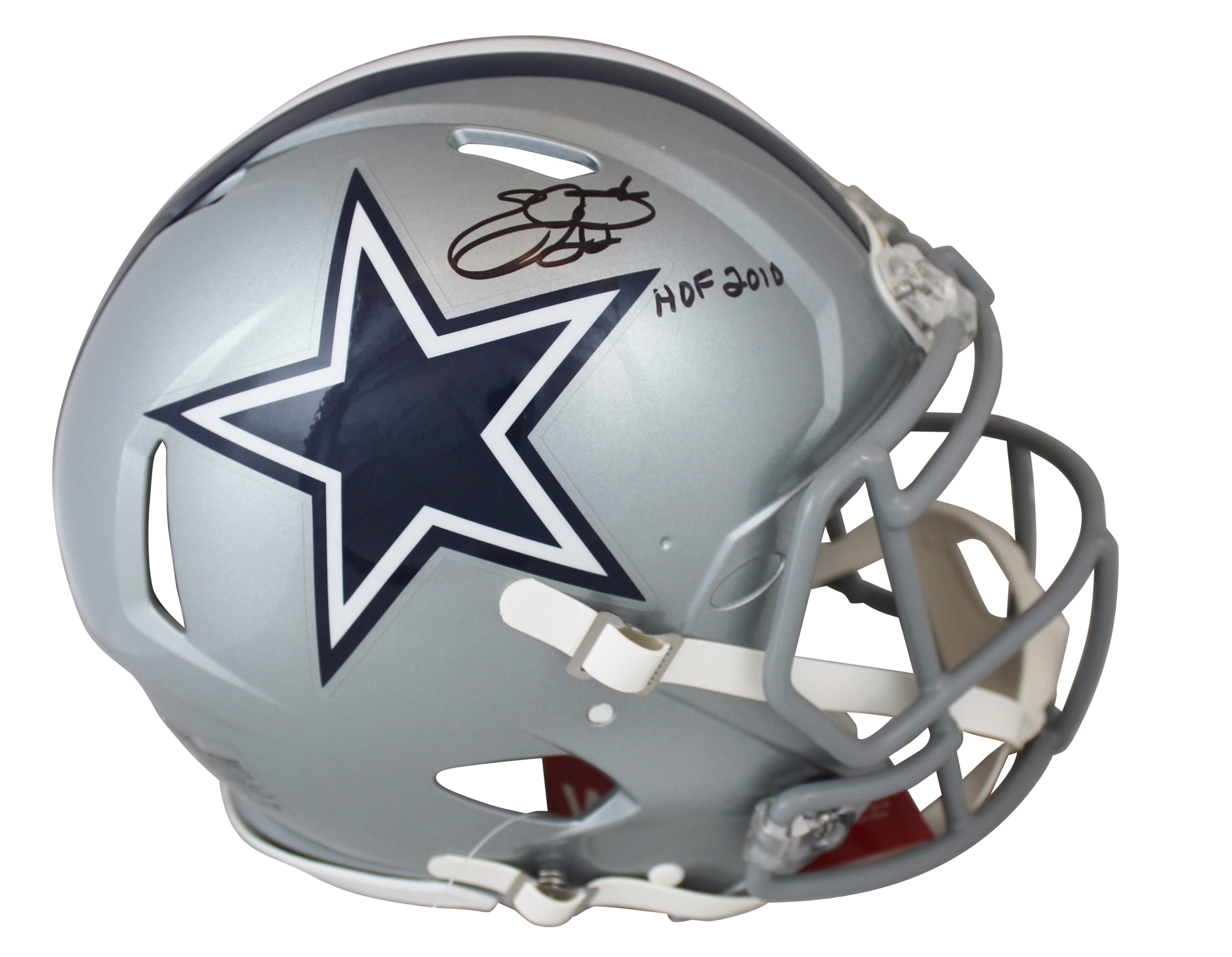 Cowboys Emmitt Smith "HOF 2010" Signed Silver Full Size Speed Proline Helmet BAS