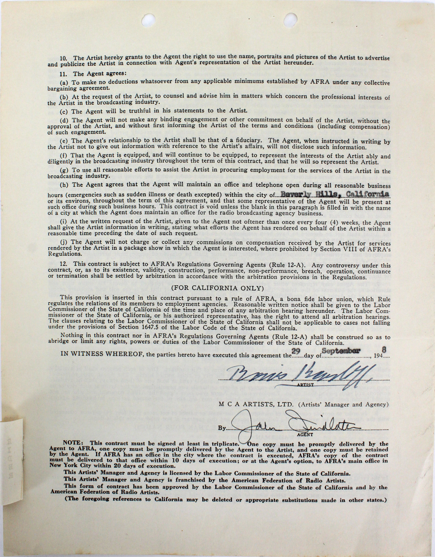 Boris Karloff Authentic Signed 8.5x11 1948 AFRA/MCA Agent Contract BAS #A57211