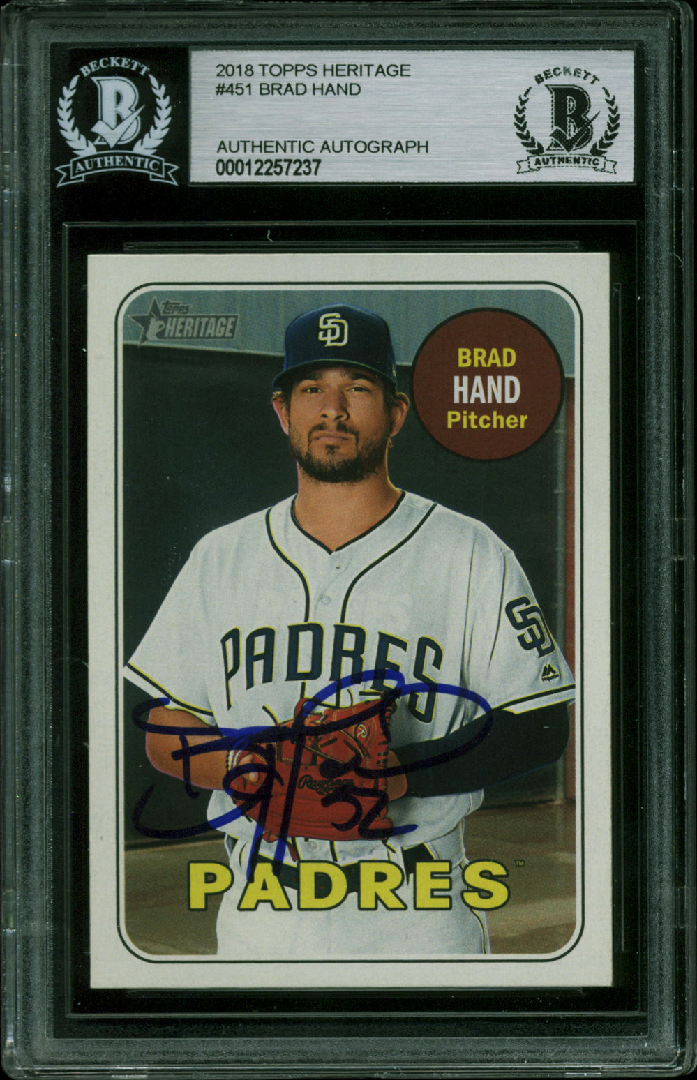 Padres Brad Hand Authentic Signed 2018 Topps Heritage #451 Card BAS Slabbed