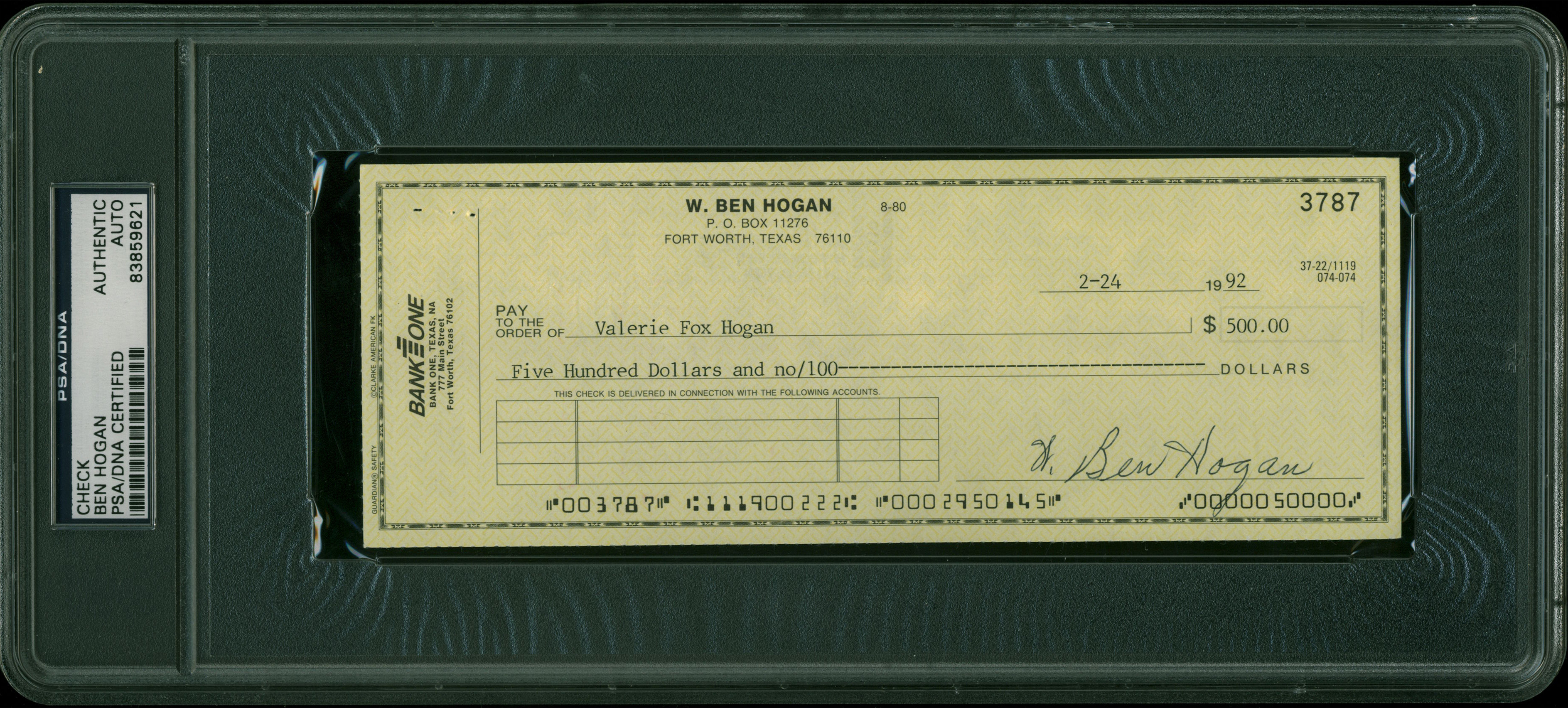 Ben Hogan Authentic Signed 3x8.25 Check Dated 2-24-1992 PSA/DNA Slabbed