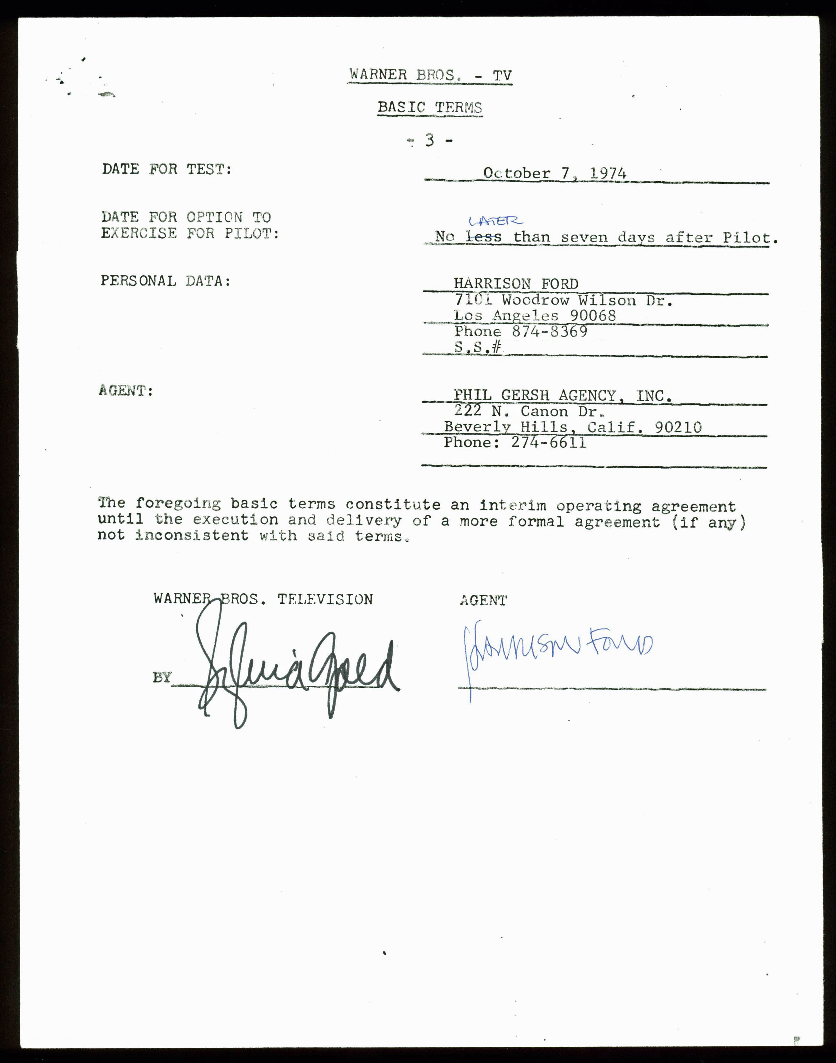 Harrison Ford Search For The Gods Signed 1974 Pilot Contract BAS #A80672