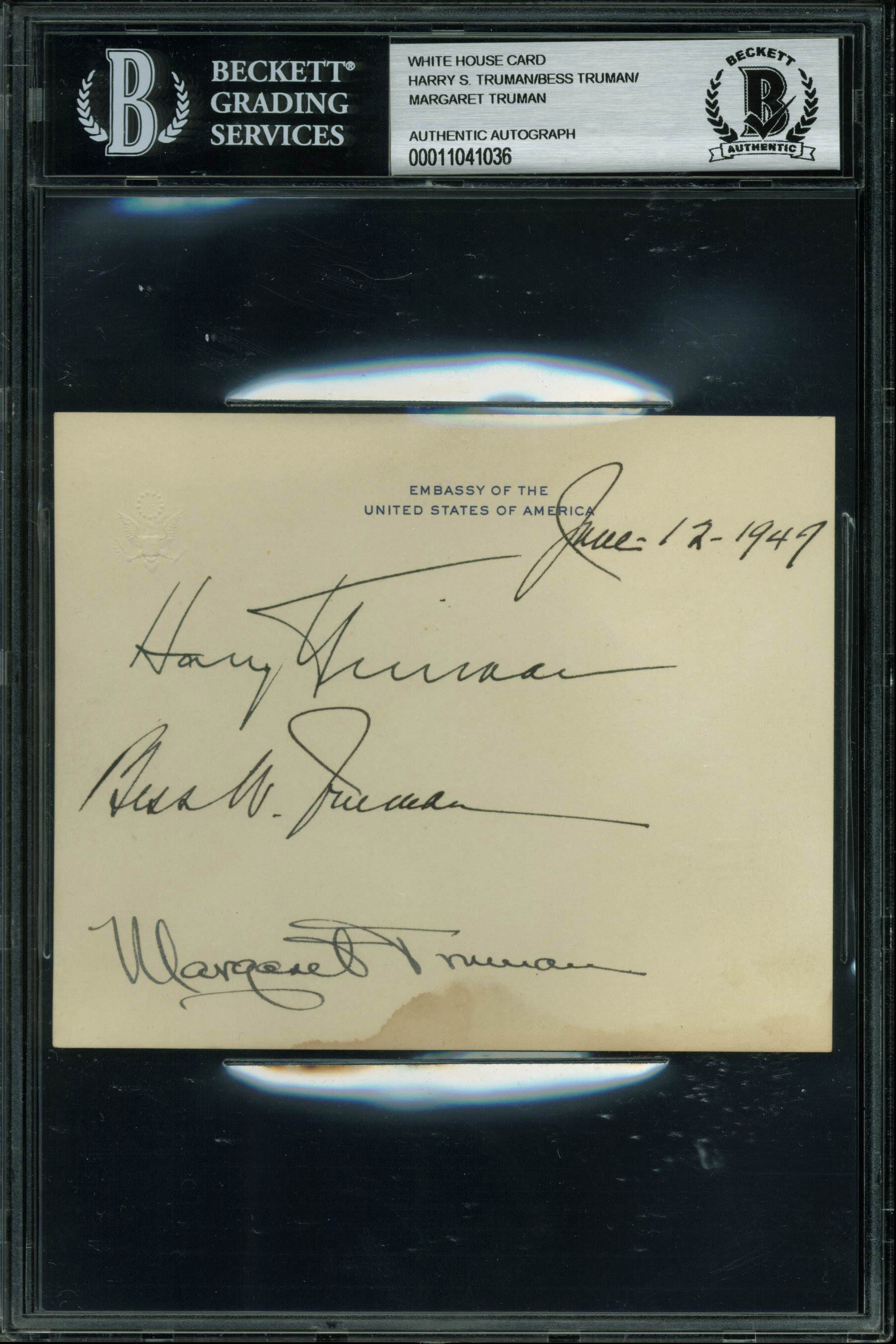 Harry S., Bess & Margaret Truman Signed 4.25x5.25 US Embassy Card BAS Slabbed