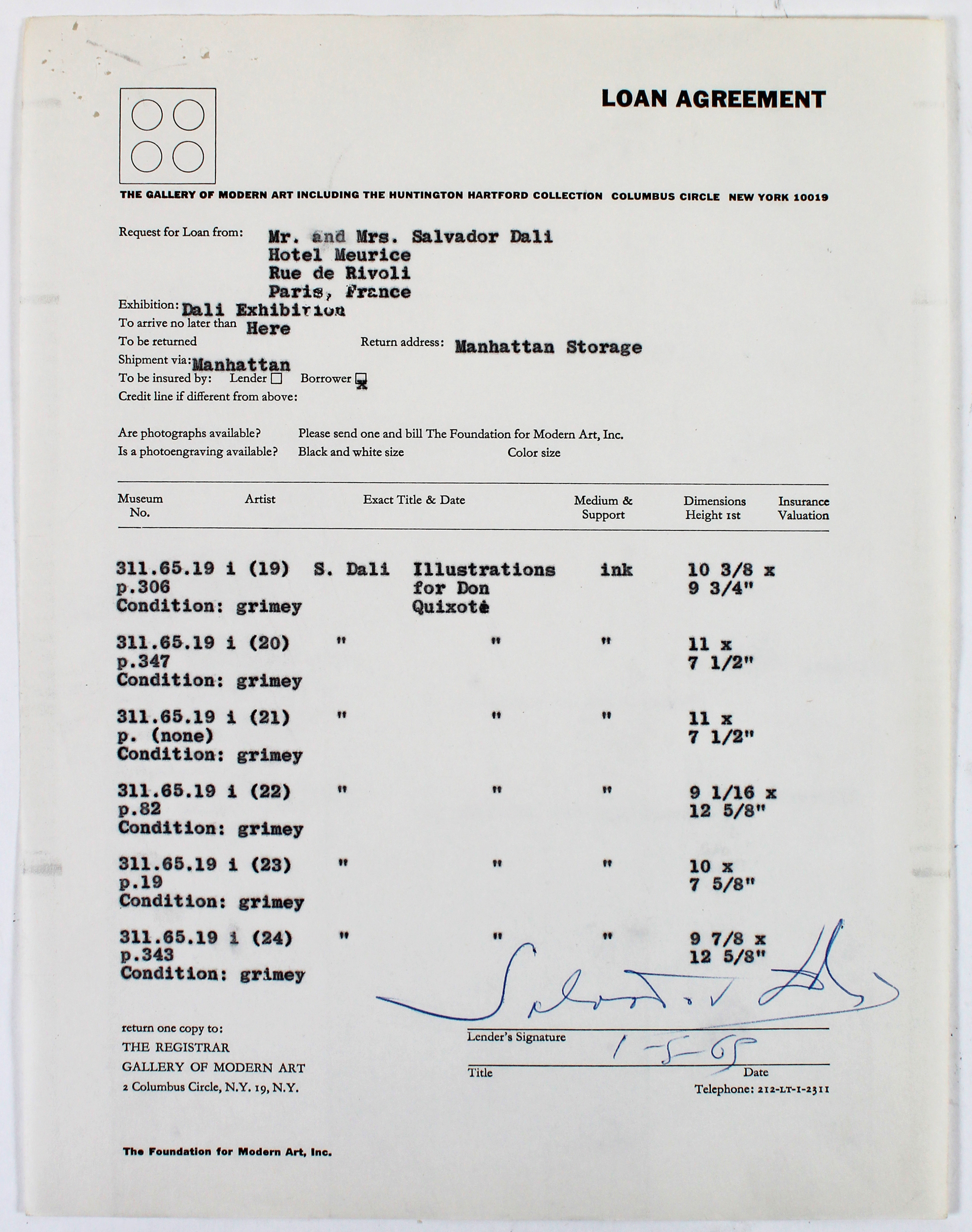 Salvador Dali Authentic Signed 8.5x11 Loan Document Dated 1-5-1965 BAS #A57677