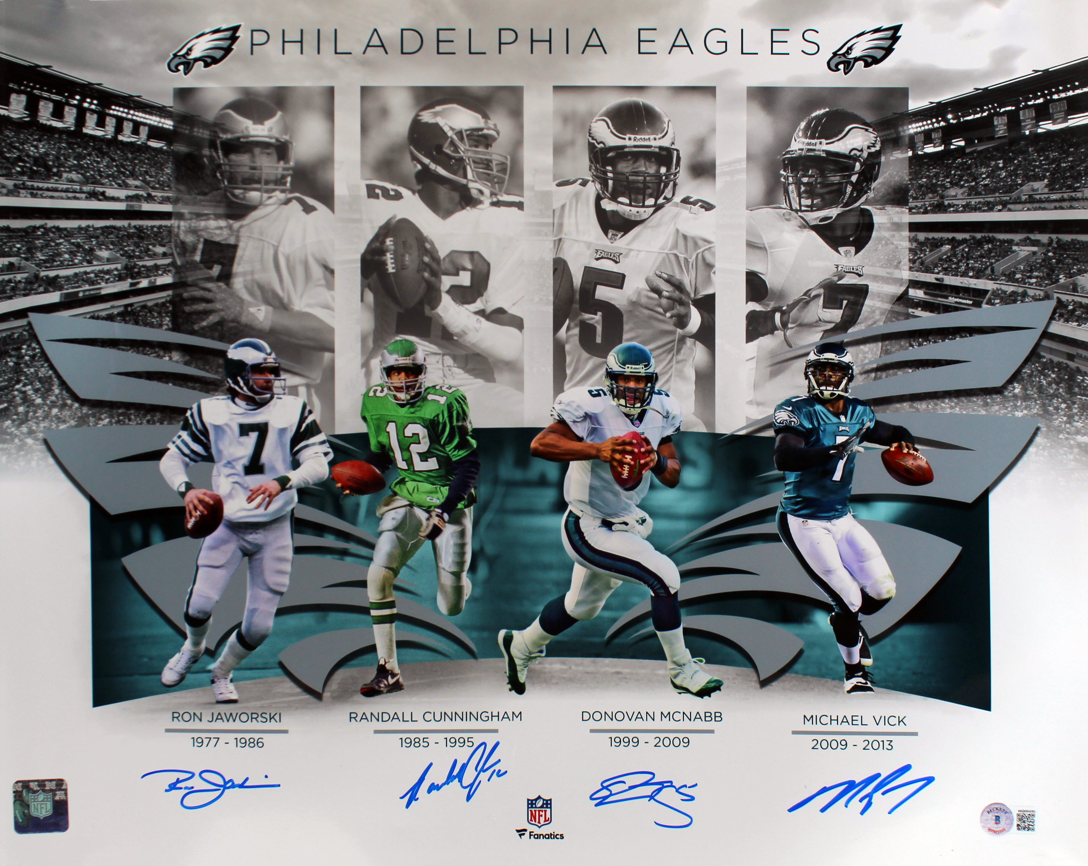 Eagles QBs (4) McNabb, Cunningham, Jaworski & Vick Signed 16x20 Photo BAS Wit