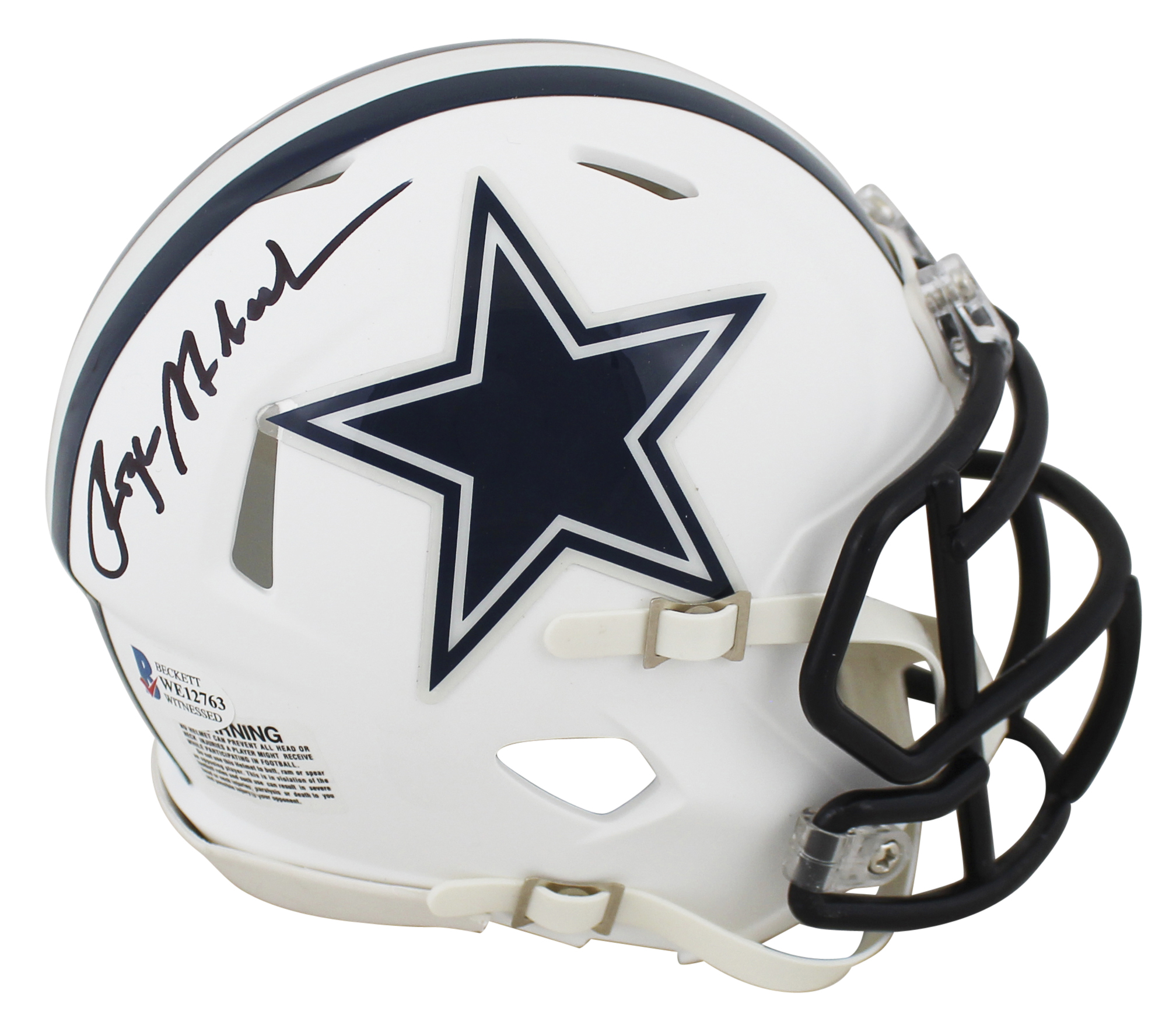 Cowboys Roger Staubach Signed Flat White Speed Mini Helmet w/ Black Sig BAS Wit