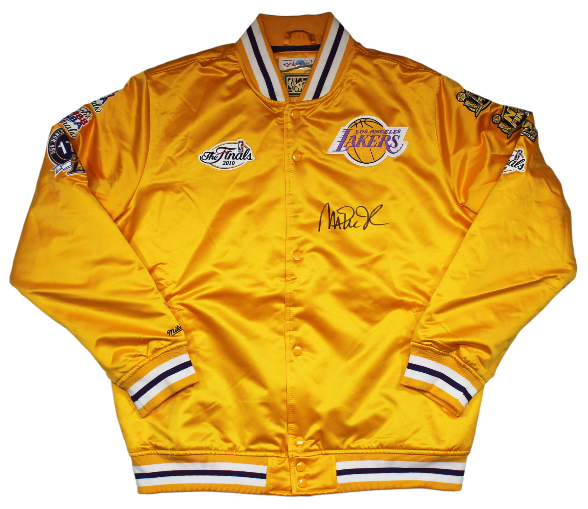 Lakers Magic Johnson Signed Yellow M&N HWC Bomber Jacket w/ Patches BAS Witness