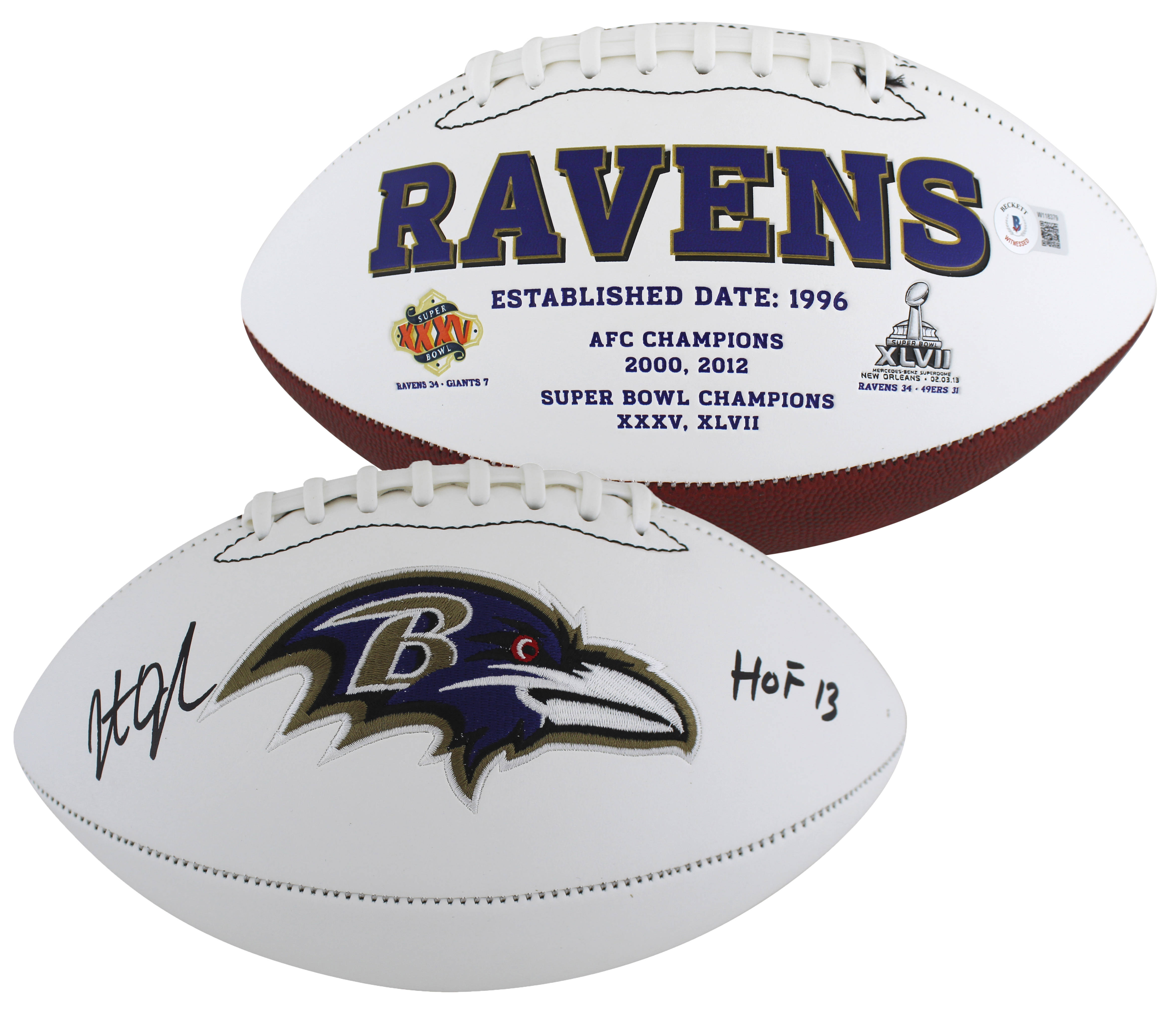 Ravens Jonathan Ogden "HOF 13" Signed White Panel Logo Football BAS Witnessed