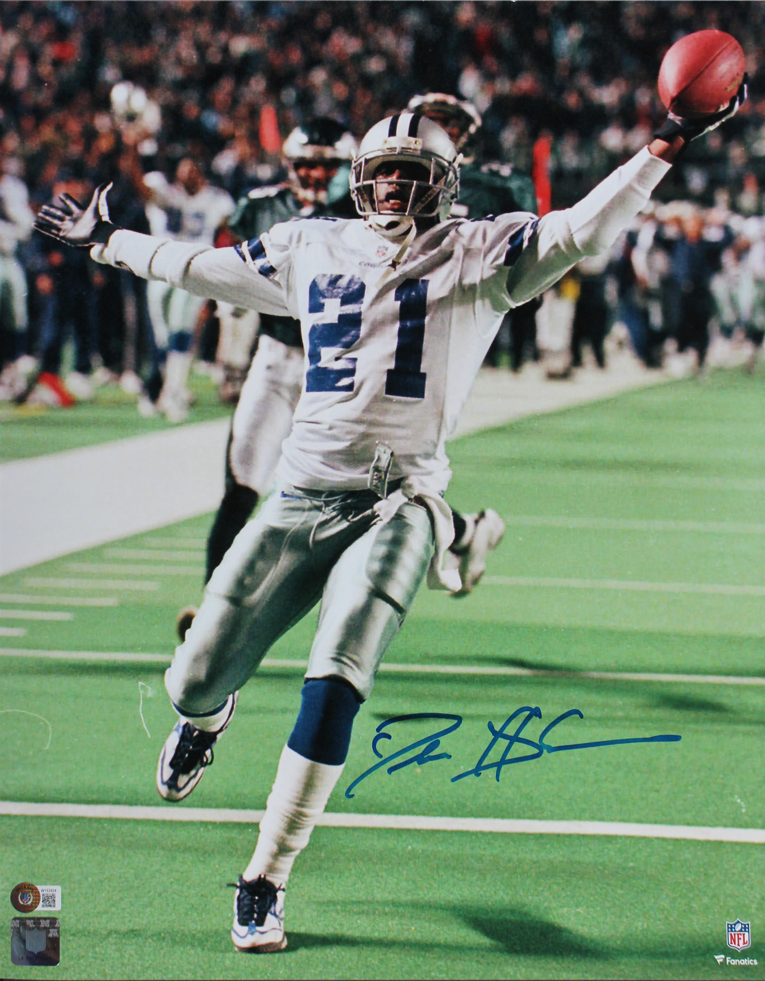 Cowboys Deion Sanders Signed 16x20 Vertical Photo Vs Eagles BAS Witnessed