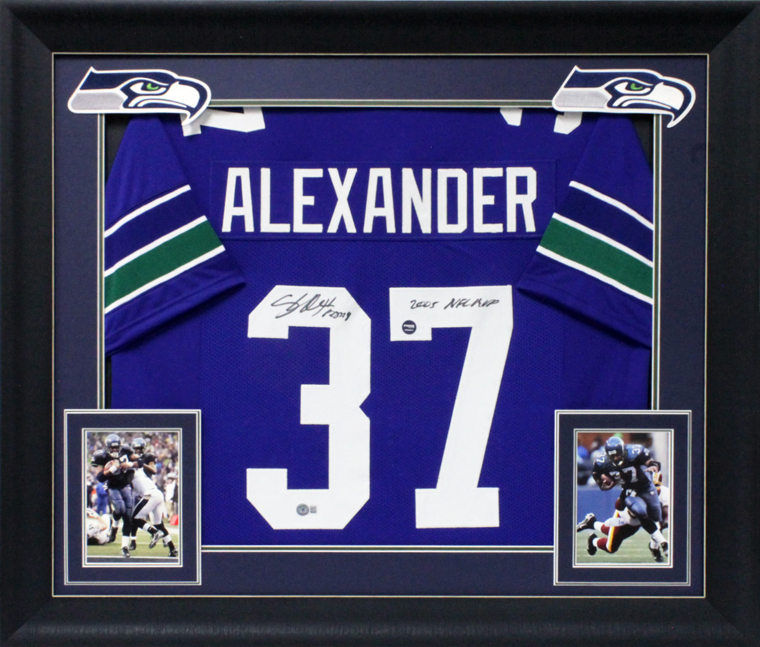 Shaun Alexander "2005 NFL MVP" Signed Navy Blue Pro Style Framed Jersey BAS Wit