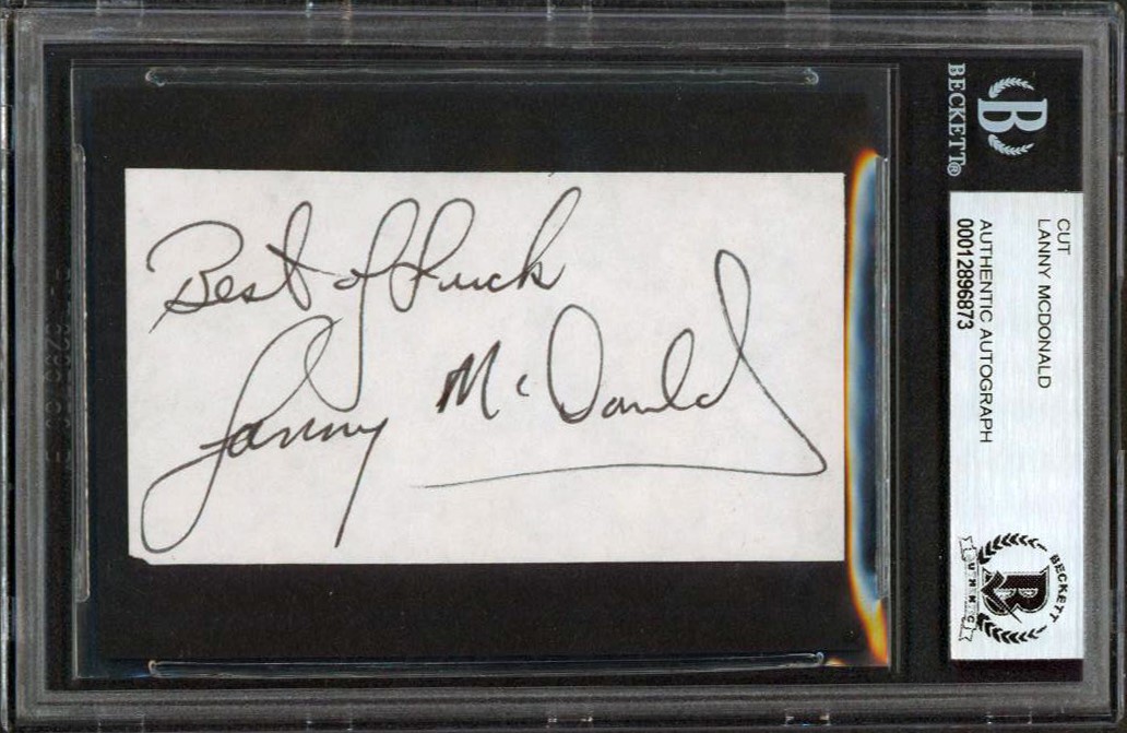 Flames Lanny McDonald "Best Of Luck" Signed 1.75x3.25 Cut Signature BAS Slabbed