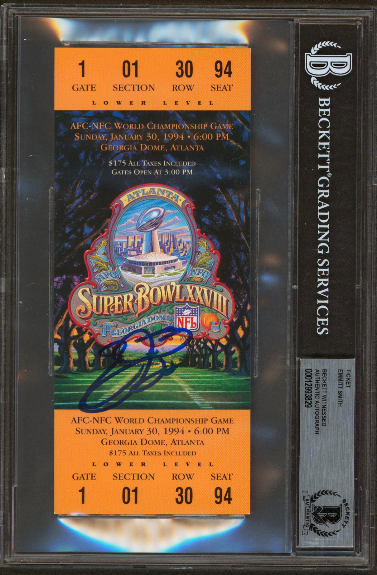 Cowboys Emmitt Smith Authentic Signed SB XXVIII Replica Ticket Stub BAS Slabbed
