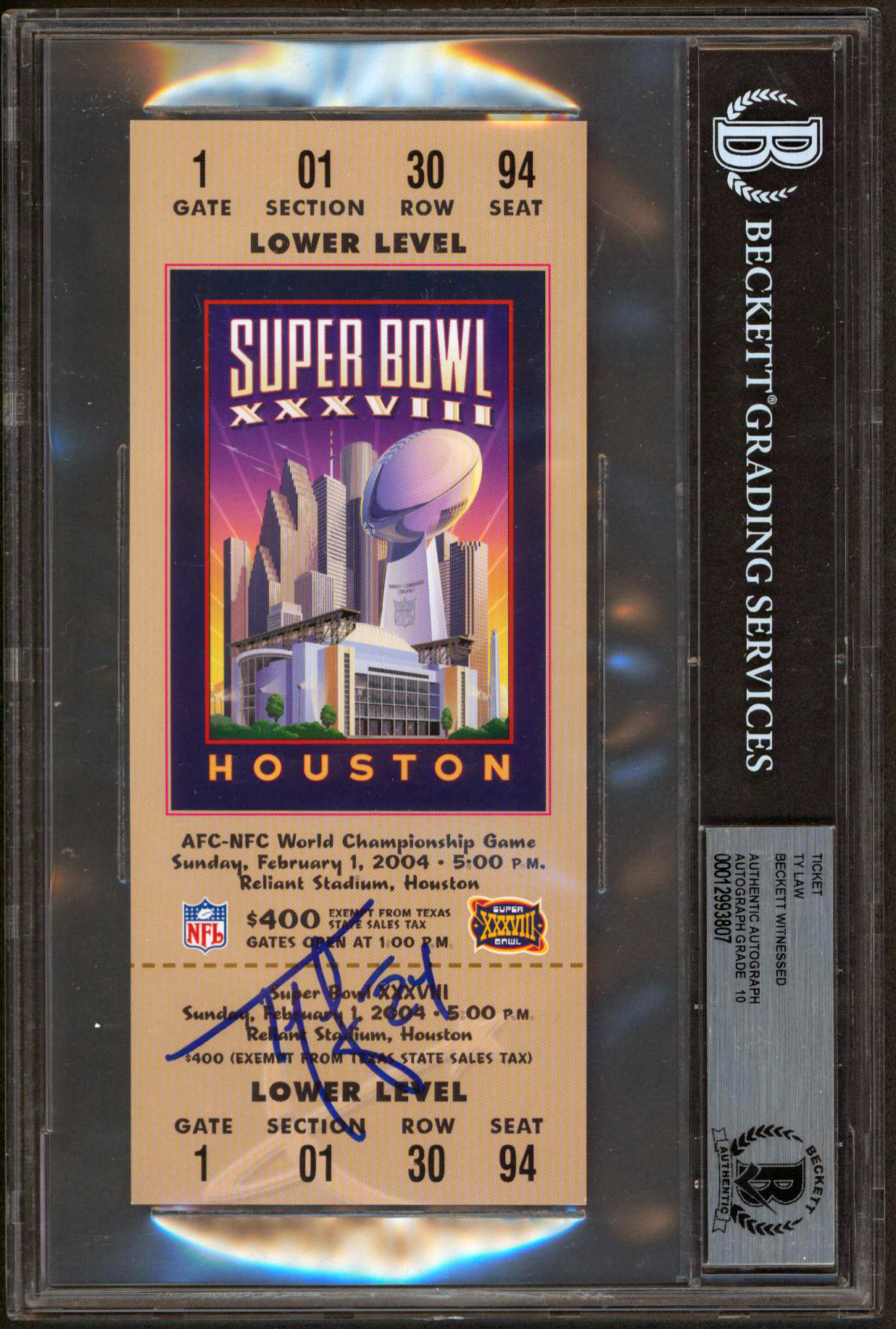 Patriots Ty Law Signed SB XXXVIII Replica Ticket Stub Auto 10! BAS Slabbed