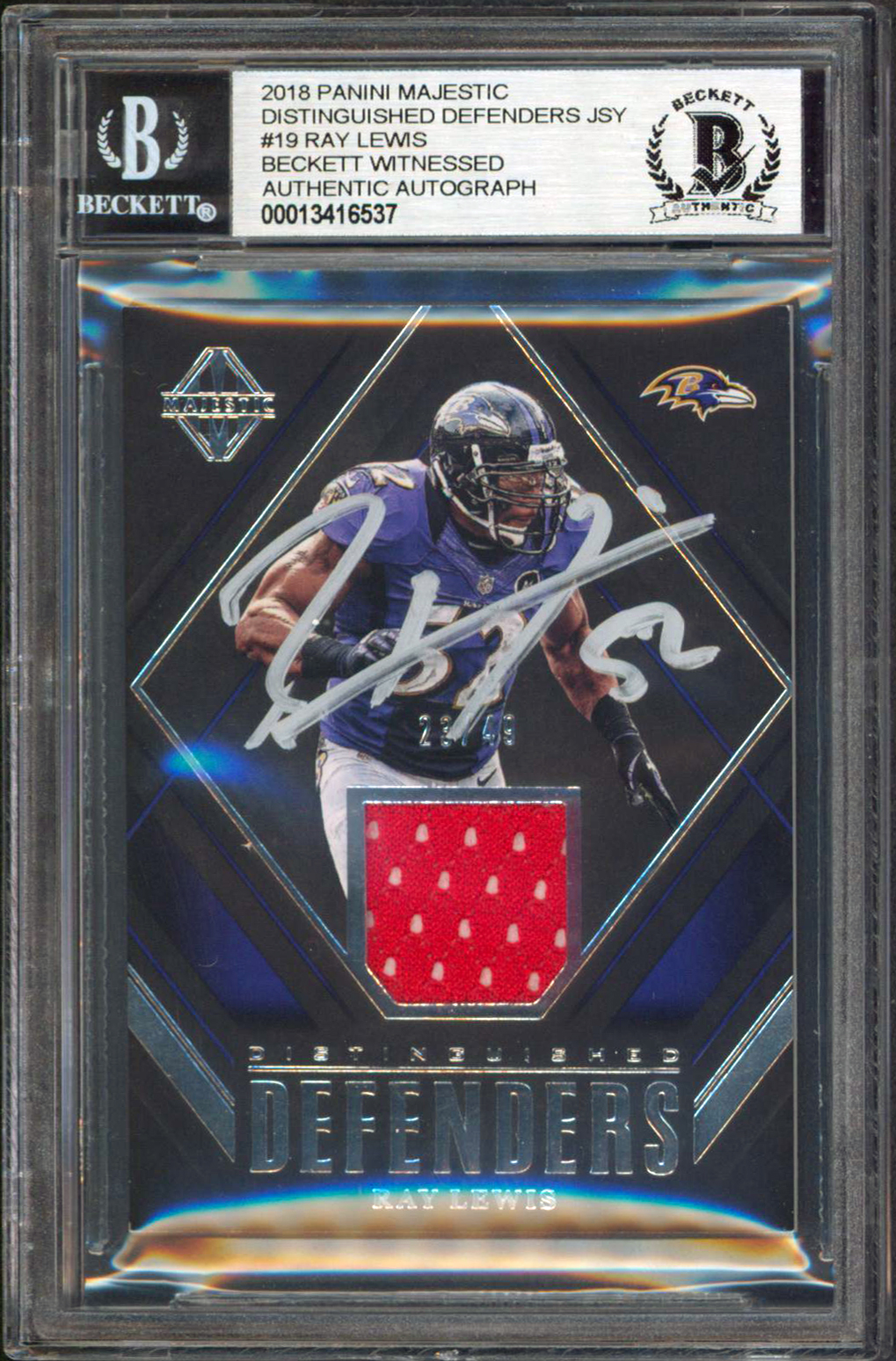 Ravens Ray Lewis Signed 2018 Panini Majestic Jersey #19 23/49 Card BAS Slabbed