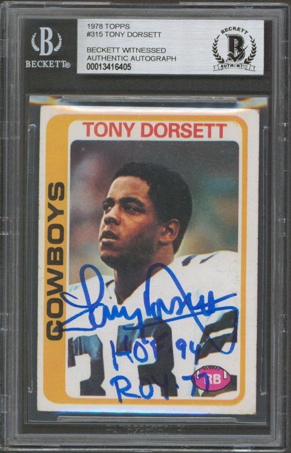Cowboys Tony Dorsett "ROY 77, HOF 94" Signed 1978 Topps #315 RC Card BAS Slab 8