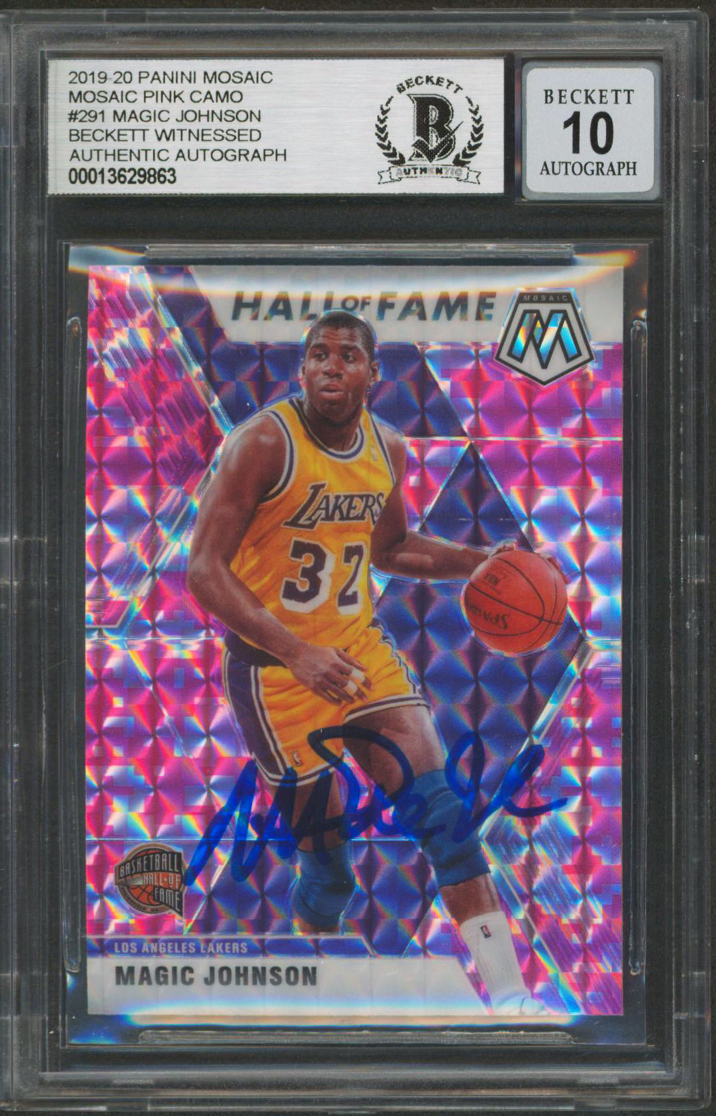 Magic Johnson Signed 2019 Panini Mosaic Pink Camo #291 Card Auto 10! BAS Slabbed